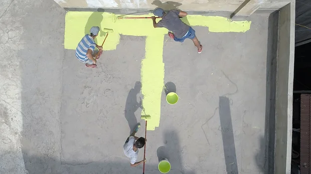 Clearing the rooftops of trash was an enormous feat before they could begin painting (Photo courtesy of Ashekman)