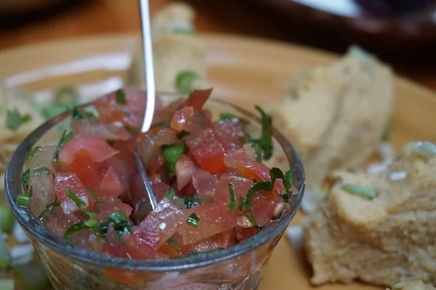 A close up of lentil kibbeh and its tomato salad (MEE/Sunniva Rose)