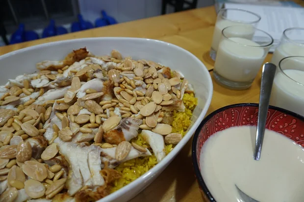 Lara Ariss's sayadieh, a Lebanese fish and rice dish, with tarator sauce and mohalabieh, a local custard (MEE/Sunniva Rose)