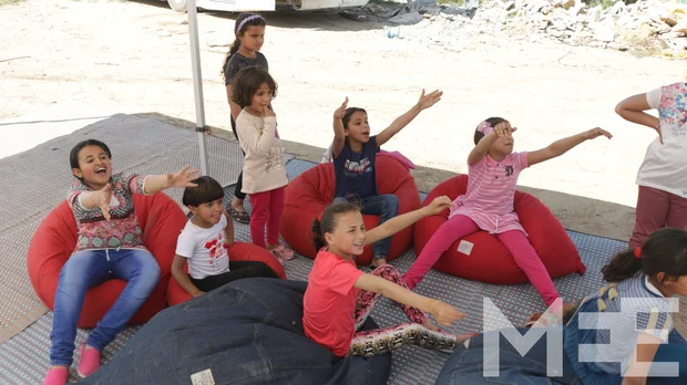 Reading activities continue next to the mobile library in Owajan (MEE/Dave Leins)
