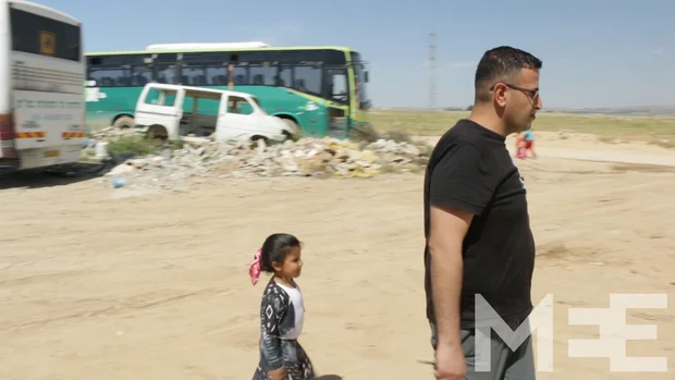 Driver Yousef al-Saane walks in front of his daughter in the unrecognised village of Owajan (MEE/Dave Leins)