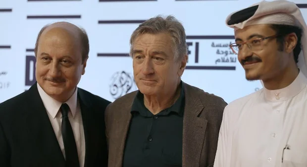 Founder of New York's Tribeca Film Festival Robert De Niro (C), poses for a photograph alongside Indian actor Anupam Kher (L) and former CEO of the Doha Film Institute, Abdulaziz Bin Khalid al-Khater (AFP)