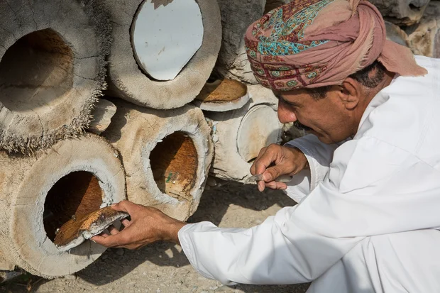 In this traditional method of Omani beekeeping, the beehive is placed in the hollowed-out trunk of a palm tree, which creates a unique flavour of honey but also protects the bees from both the summer heat and the cold in the winter season.