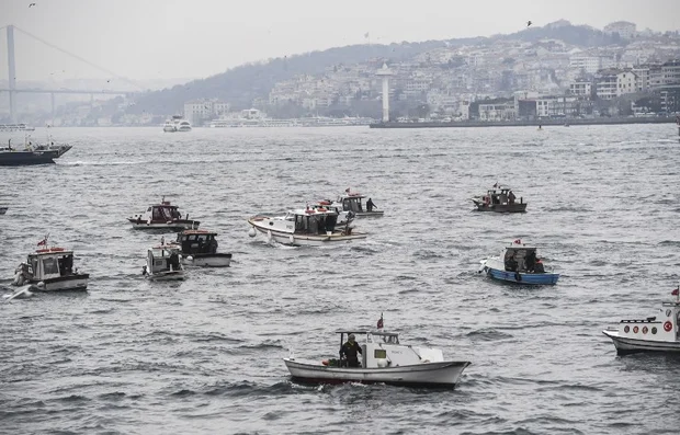 Fishermen sit aboard their crafts in the Bosphorus on 22 February, 2017 in Istanbul (AFP)