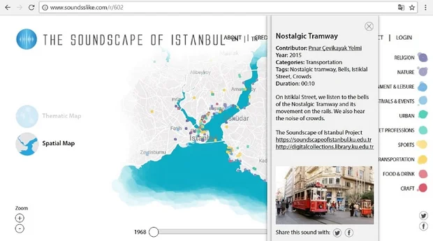 At the end of 2015, she and her advisers initiated the Soundsslike Project, a separate, interactive website dedicated to the Soundscape of Istanbul. Complete with a detailed, easy-to-navigate map, sounds can be played by category, neighbourhood, or timeline.