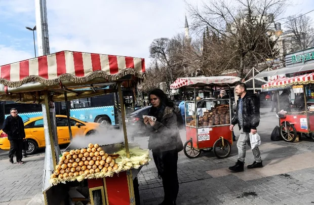 Street vendors are seen in the historical Eminonu district on 22 February, 2017 in Istanbul (AFP)