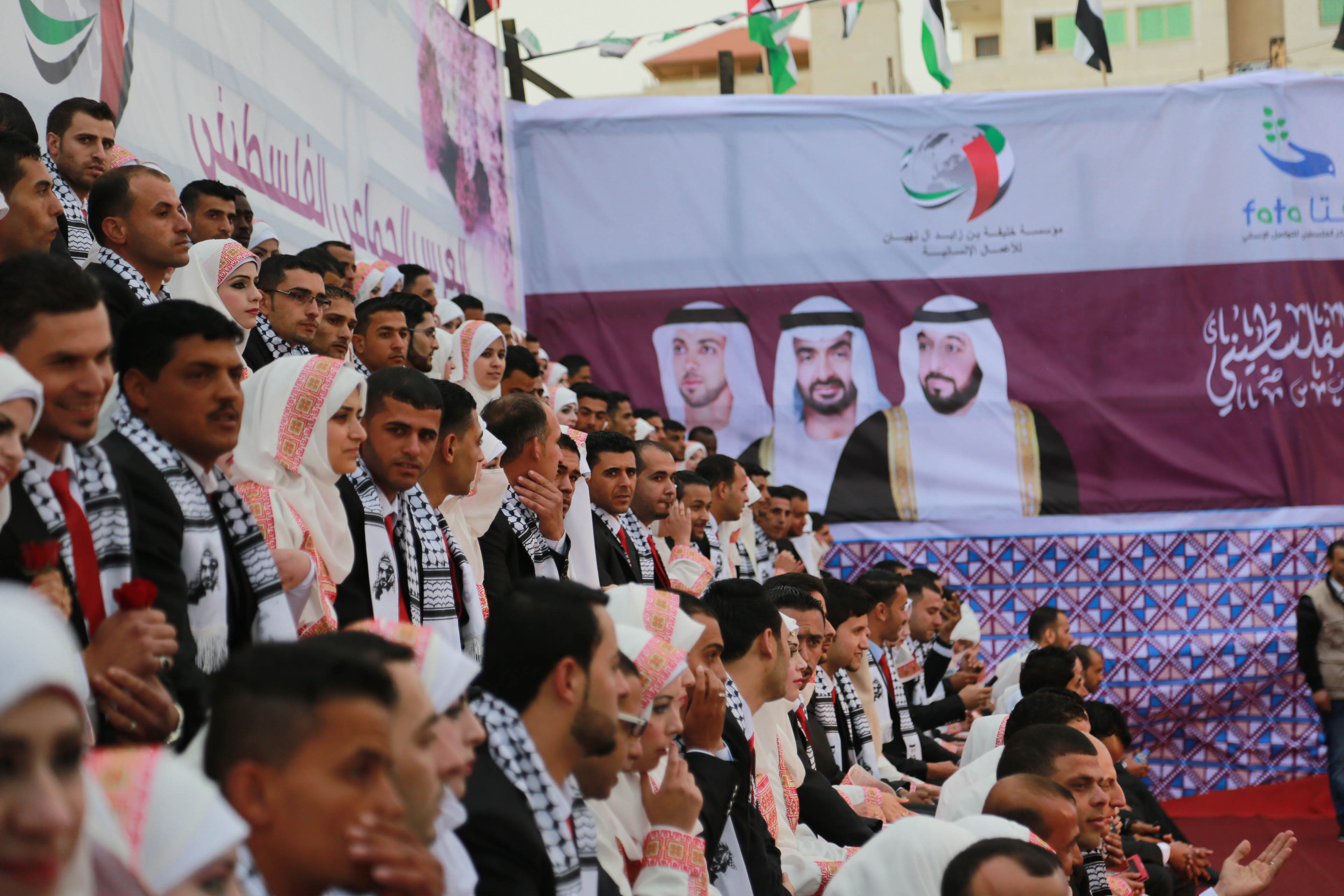 The wedding - in which some 400 Palestinian men and women got married with the financial support of the UAE - took place on 11 April in Gaza City. Such weddings happen on occasion in Palestine - where a donor provides funds for couples in financial need. Typically, thousands of couples are registered for mass weddings in Gaza, waiting for new funding to come through and to be chosen by Palestinian political leaders.