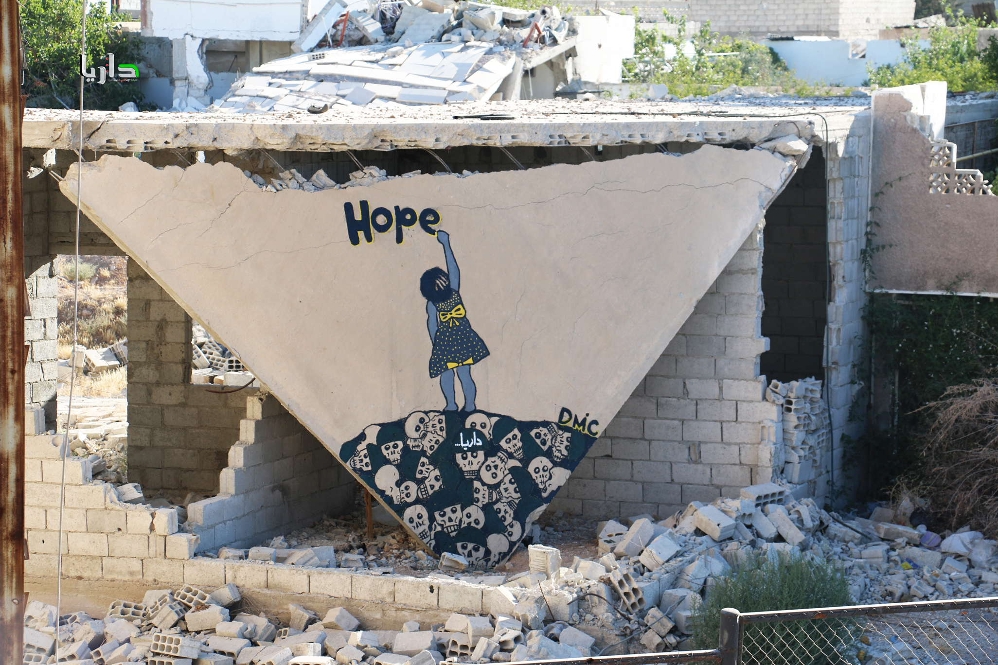 The “Hope” mural of August 2014 was the first of his works to reach an audience outside of Daraya. That image portrayed a young girl standing over a mound of helmet-clad skulls: a promise of future beauty that shines through the pain of the present. The photos soon beamed over television channels and streamed through Facebook feeds across the Arab world, launching Shami to newfound stardom among a community of rebels in need of encouragement.