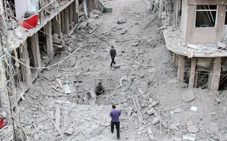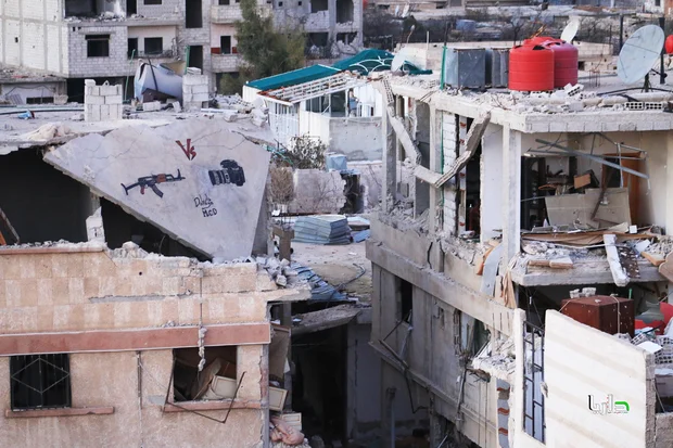 Shami had no shortfall of suitable canvases. UN staff visiting Daraya in April estimated that approximately 80-90 percent of the city’s infrastructure had been destroyed by a combination of prolonged artillery fire, barrel bombs, and the tsunami of Russian shelling that began with the military intervention last September.