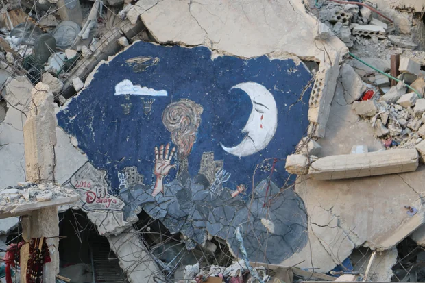 DARAYA, Syria - Leaning into a slab of roof hanging precariously over one of Daraya’s many shattered streets, Abu Malek al-Shami worked furiously through the night. He strained his eyes against the shadows: the full moon was just bright enough to illuminate the tip of his brush, while just dark enough to obscure his skinny figure from the snipers training their gaze on the streets behind him.