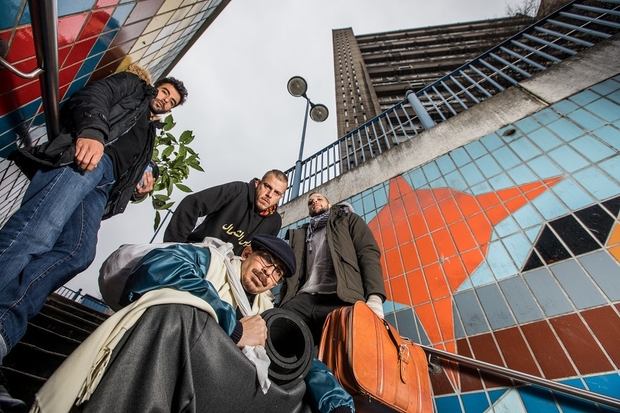 47Soul poses in front of Balfron Tower in East London, where the band once lived (Photo courtesy of Victor Frankowski/CONTENT)