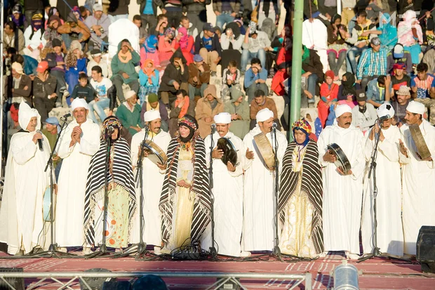 The festival is held in mid-October and dust stirs high into the air, jostled into motion by the movement of thousands of feet. In that mass of people, young men and women can be seen eyeing each other. The women are sometimes dressed in the traditional garments of their tribe – the white tahendirt (cloak) with glittering coins of the Ait Iazza tribe, or the dark ones worn by the Ait Brahim.