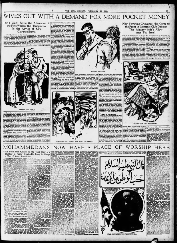 Dated 25 February 1912, the story, featured in The New York Sun, describes a “Turkish chapel” for “those who believe in Allah and Mohammed” located on the third floor of a building on Rector street in downtown Manhattan.