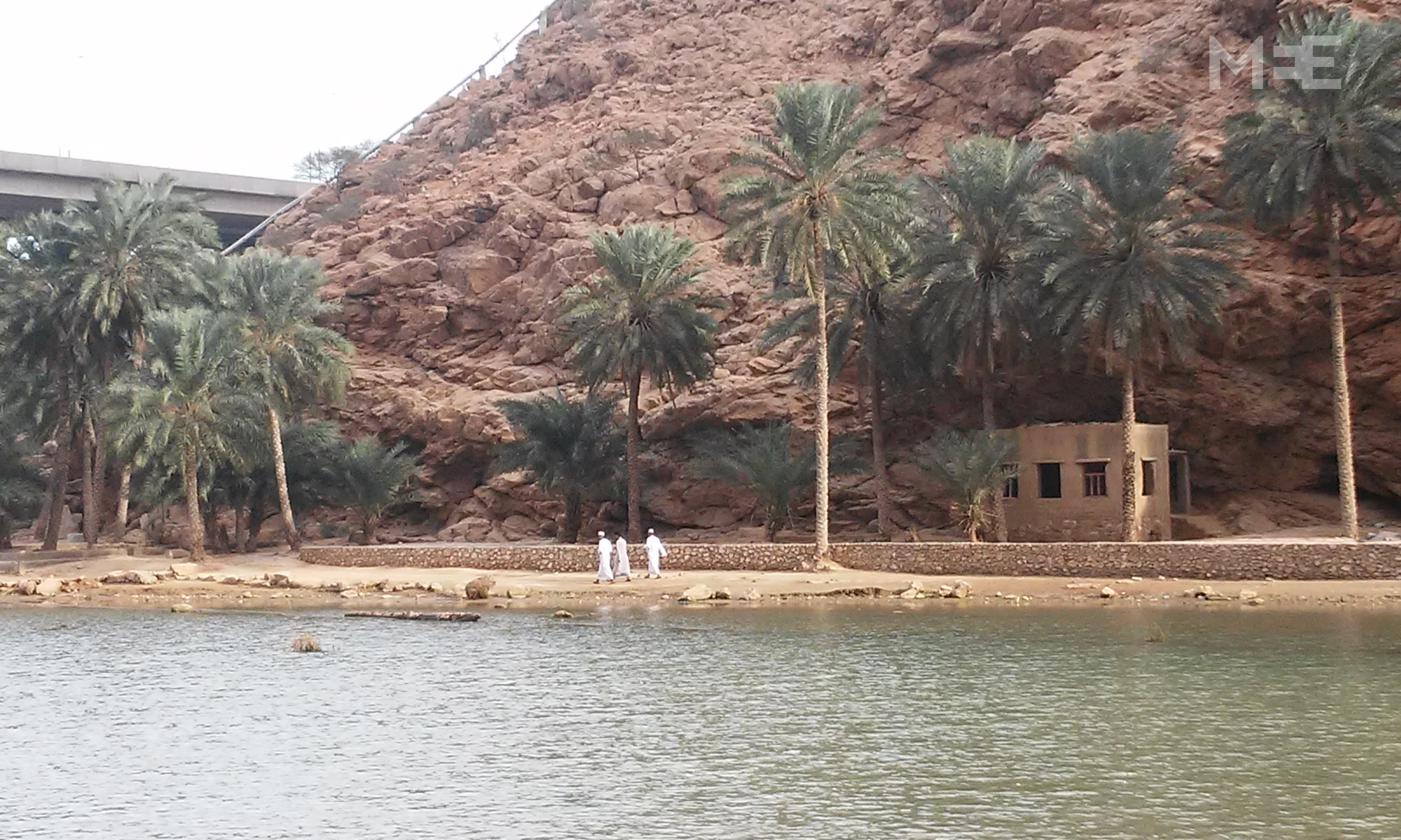 Three men stroll along the bank of Wadi Shab (MEE/Madeleine Miller)