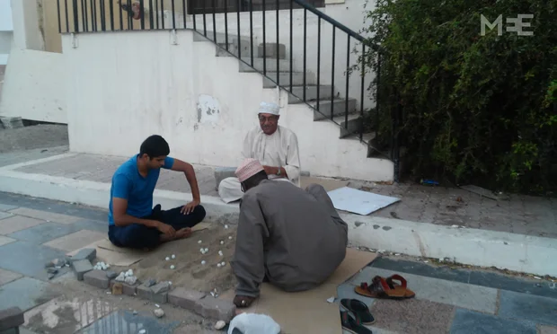 'A group of men enjoying a game of Hawalis at Muttrah Corniche' (MEE/Madeleine Miller)