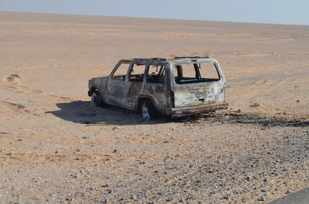 Heading north from Salalah, highway 31 is the only main road linking southern Oman with Muscat along a route of mostly flat, featureless rocky desert. In the past it was notorious for abandoned wrecks of cars and lorries along its unbroken stretch of road. During our trip we spotted a handful of such wrecks, some new, although a major construction effort to improve the road is in evidence for much of the route, making it less dangerous than in the past.