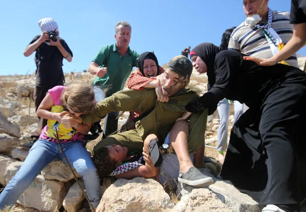 What happened next was caught on camera in a series of photos depicting a young boy being pinned to the ground by an Israeli soldier, as the boy’s mother, aunt and sister struggle to pry the grown man off the child.
