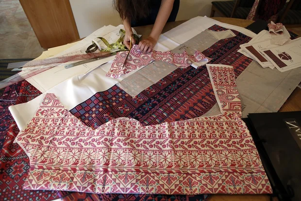 Palestinian fashion designer Natalie Tahhan is hard at work in her Jerusalem studio, replacing the painstaking processes of cross-stitching and embroidery with a laptop computer and printed fabric.