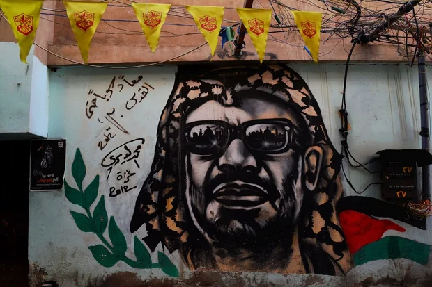 Palestinian national symbols such as the Al-Aqsa mosque in Jerusalem, maps and flags of Palestine and portraits of late Palestinian leader Yasser Arafat fill the walls of the camp. Arafat is seen by many locals as a freedom fighter and a symbol of Palestinian national aspirations.