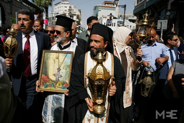 The Sabt al-Nour parade culminated in the central square of al-Manara where a car escorted by Palestinian police delivered the Holy Fire hailing from the Church of the Holy Sepulchre in Jerusalem. Due to Israel's ongoing military occupation of the West Bank and Gaza, Palestinians are barred from travelling freely to Jerusalem.