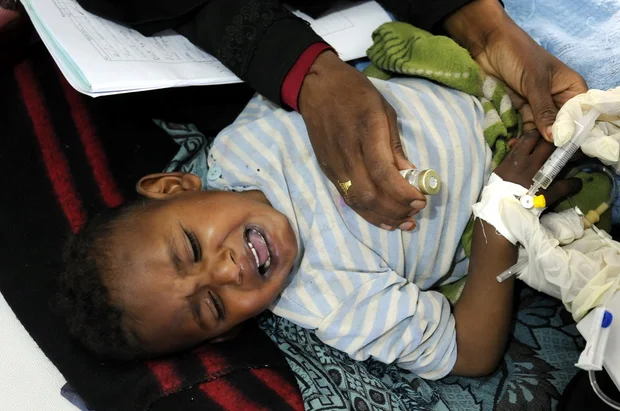 At the hospital new cholera cases keep arriving. Three-year-old Zain al-Abideen al-Sabari lies on the ground of the hospital lobby as he receives IV treatment.