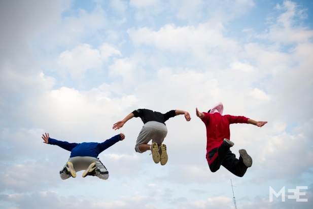 In Jerusalem, Sami and his friends, particularly Jihad, 19, and Mahmoud, 17, practice free running above the streets of the old market, on the walls of the old city, on the top of the Wall, in their university: in every corner they can find for their back flips.