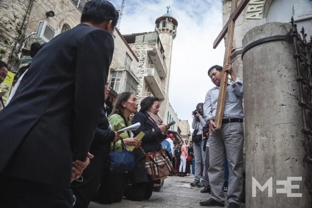 But as the procession sweeps through the Old City, the turnout seemed particularly underwhelming. Although there are thousands of Christian pilgrims, curious passersby and tourists alike, the crowds in the alleyways are always moving, unlike the typical jam-packed hordes.