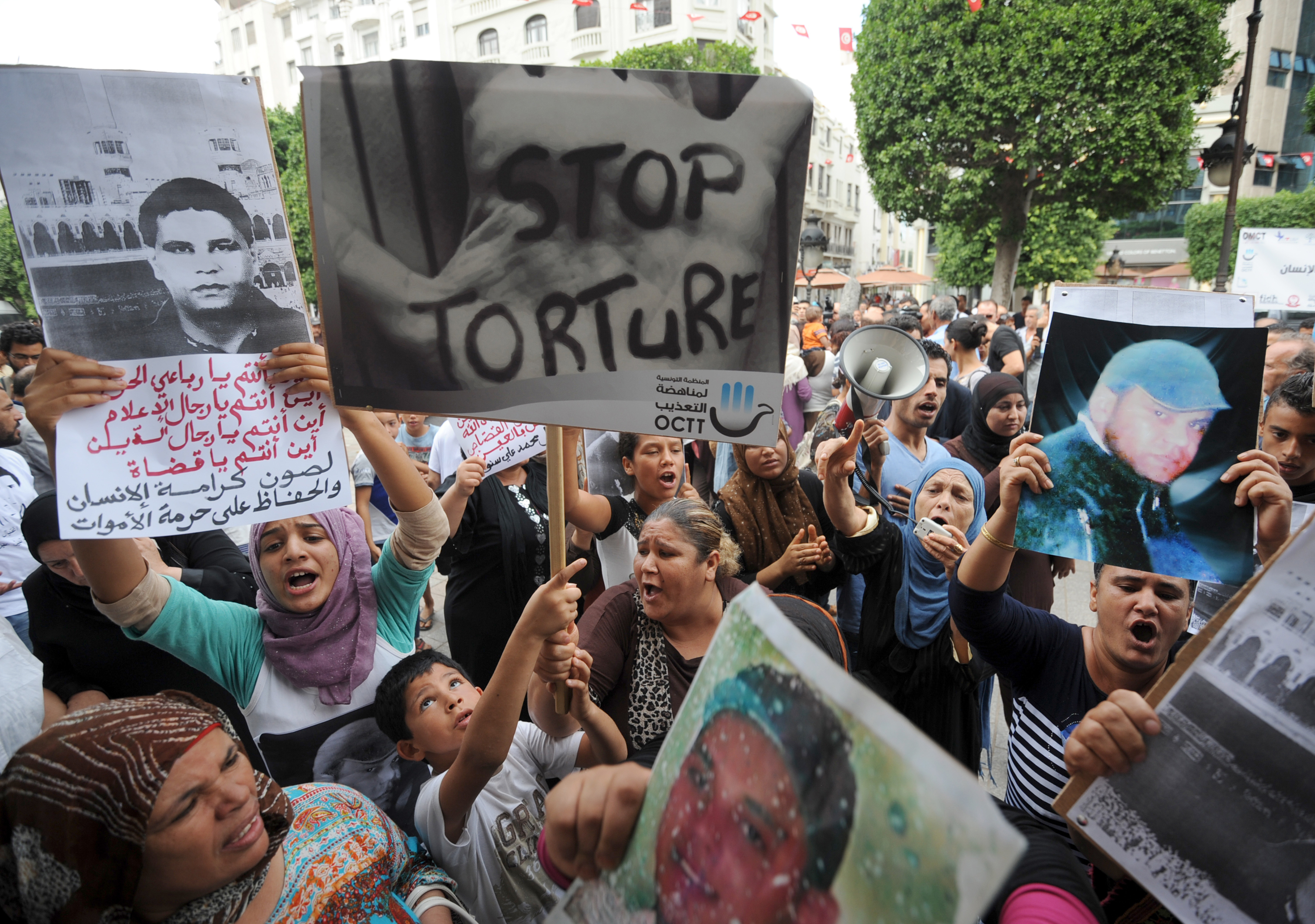 Tunisian protesters denounce the use of torture and call for reform of the Tunisian police, at the headquarters of the Ministry of Interior in Tunis on 15 October, 2014 (AFP)