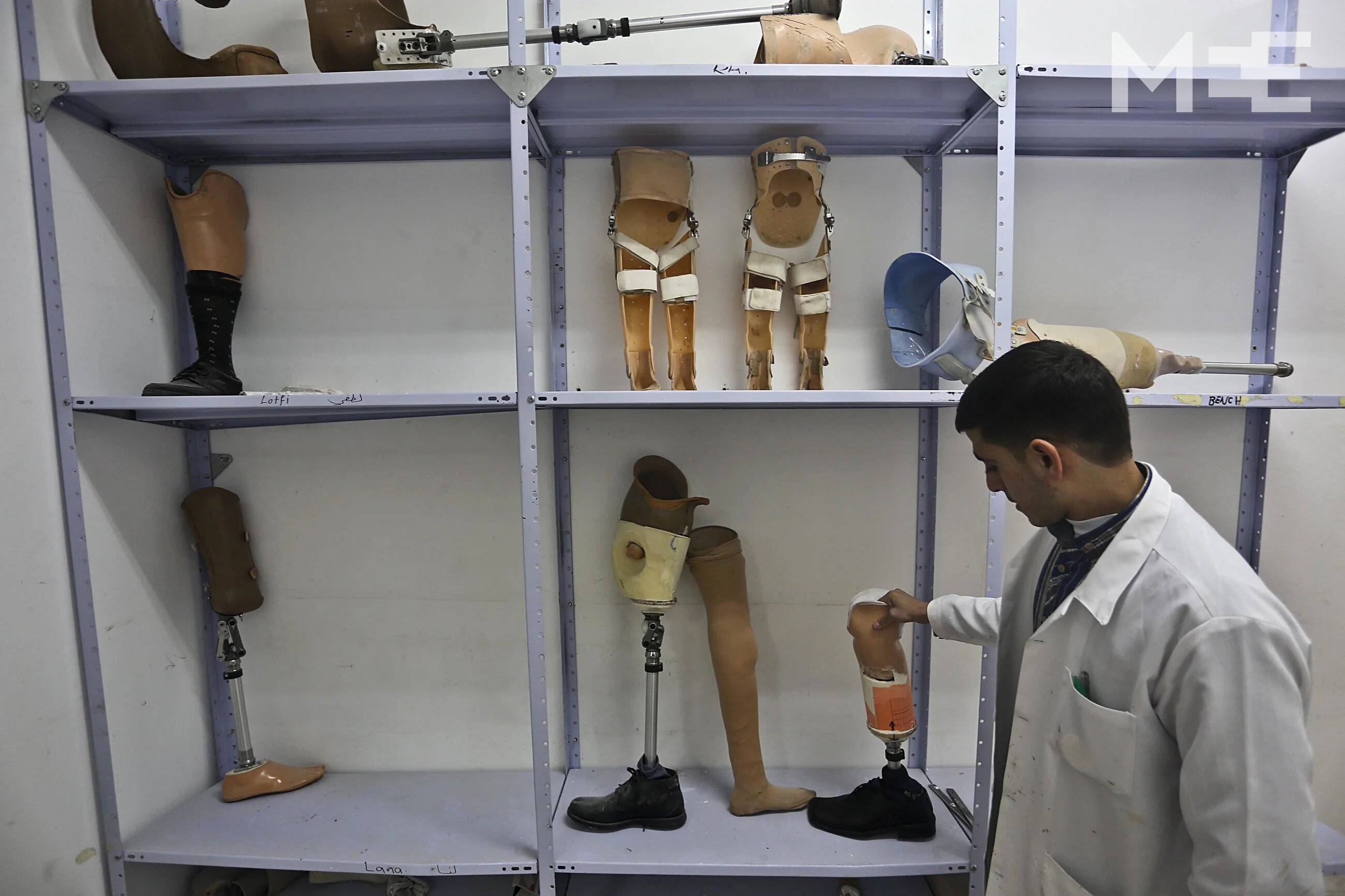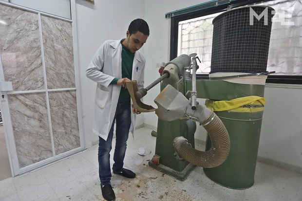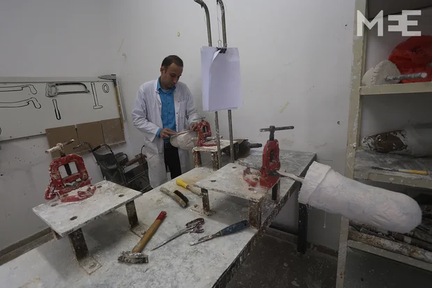 Inside the centre is a factory that produces all specifications of artificial limbs - Mohammed Sobeh, 22-years-old and an occupational therapist stands making an artificial leg for a 10-year-old child, another amputee from Israel's war on Gaza.