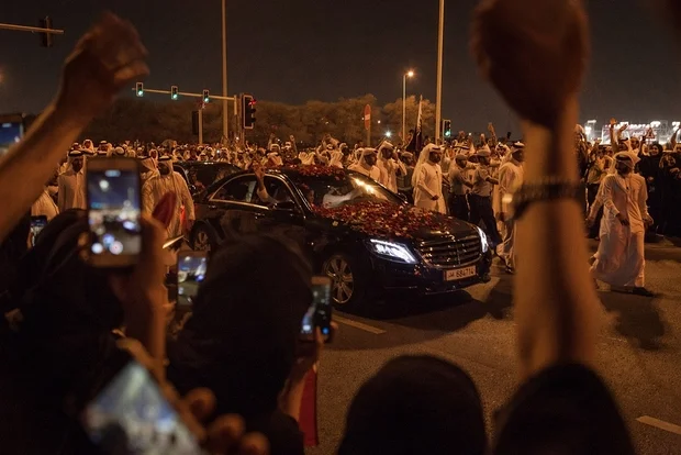 At around 7.30pm, the emir arrived in a car covered in rose petals. He waved his hand to greet the crowds, as his convoy moved ahead slowly and the people shouted his name in praise and waved the national flag.