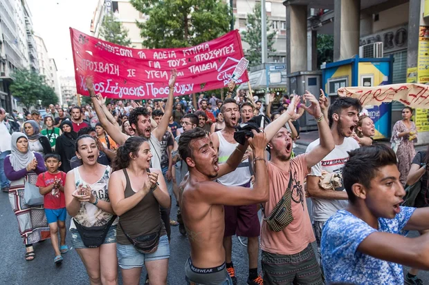 Later that week, on a hot summer afternoon, hundreds of refugees and solidarity activists take to the streets, demanding better conditions and shelter for refugees. One group of Syrians holds a banner that reads, “A quick death in Syria, a slow death in Europe”. Chants of “Freedom” and “Open the cities, open the borders” emanate from Athens' crowded Omonia square.