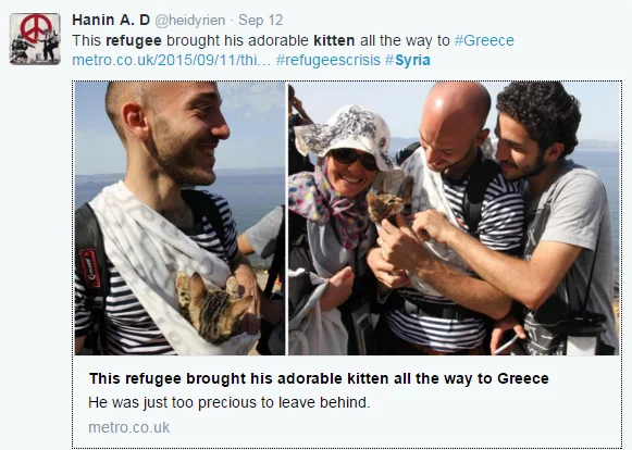 Another refugee could not part with was his kitten, Zaytouna (Arabic for olive), who he carried in a homemade sling all the way to the Greek island of Lesbos.