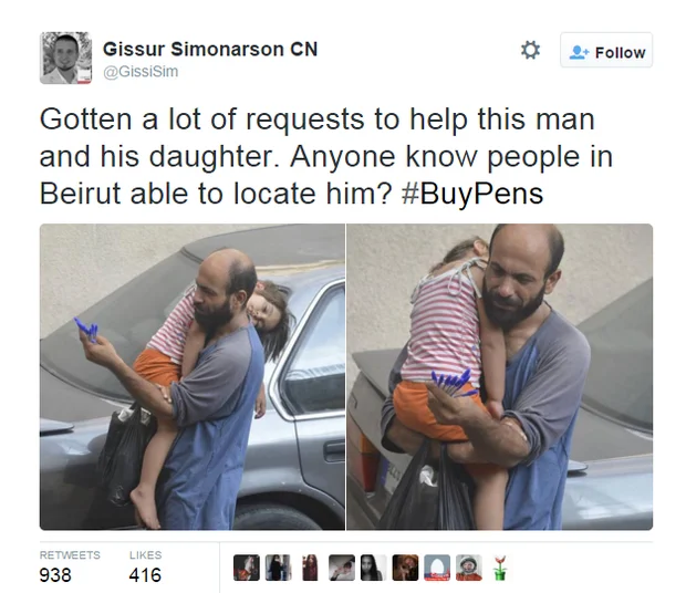 In August, Gissur Simonarson, a journalist with Conflict News, shared a photo on his Twitter page of a refugee in Beirut selling pens as his daughter slept in his arms. He began a campaign to track the man down, hoping to help.