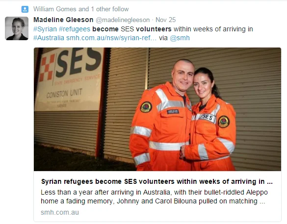 There's also the story of Syrian refugees Johnny and Carol Bilouna who joined the State Emergency Service (SES) within a month of arriving in Australia. They have been trained in flood and bushfire rescues and say it is their way of giving back to the Australian community which has welcomed them to their new home