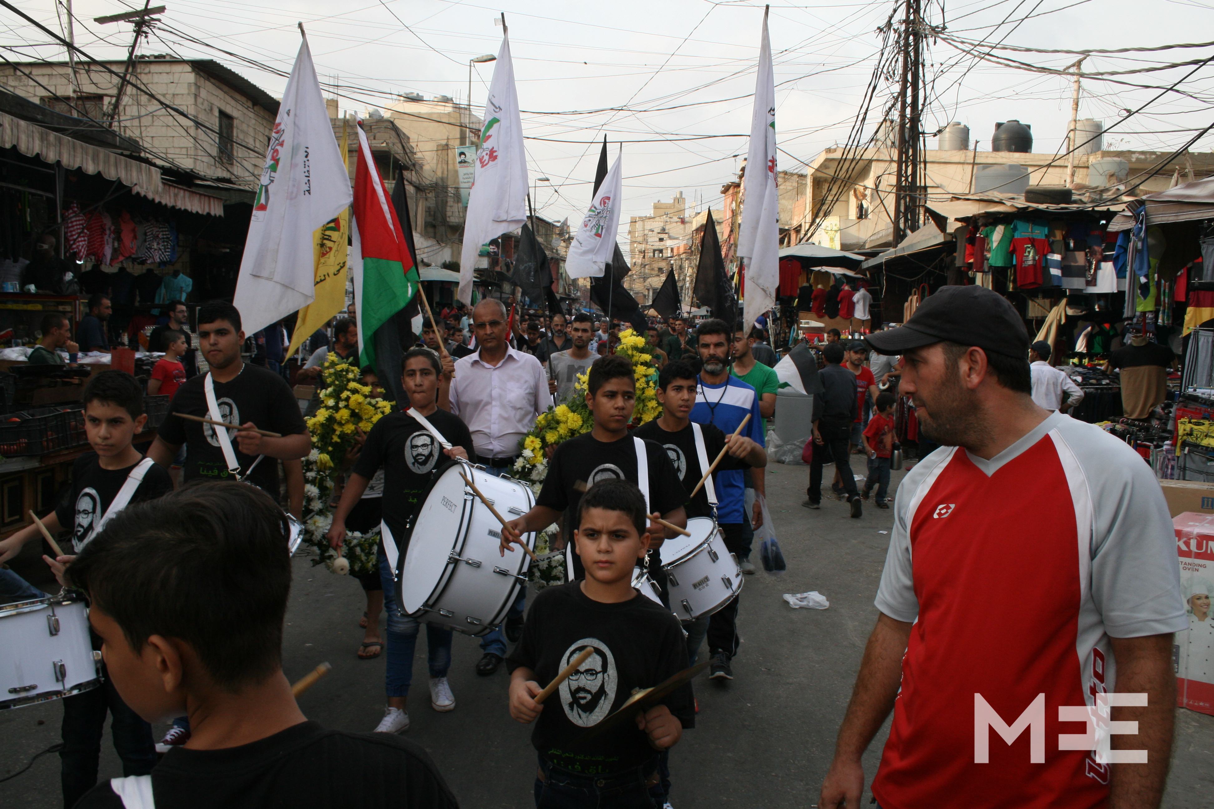 The annual commemoration saw hundreds weaving their way through Shatila’s narrow alleys. Flags representing various Palestinian groups caught on tangled masses of power cables that drape between buildings. Boy scouts enthusiastically banged drums almost as big as their tiny bodies, through streets awash with puddles of sewage.