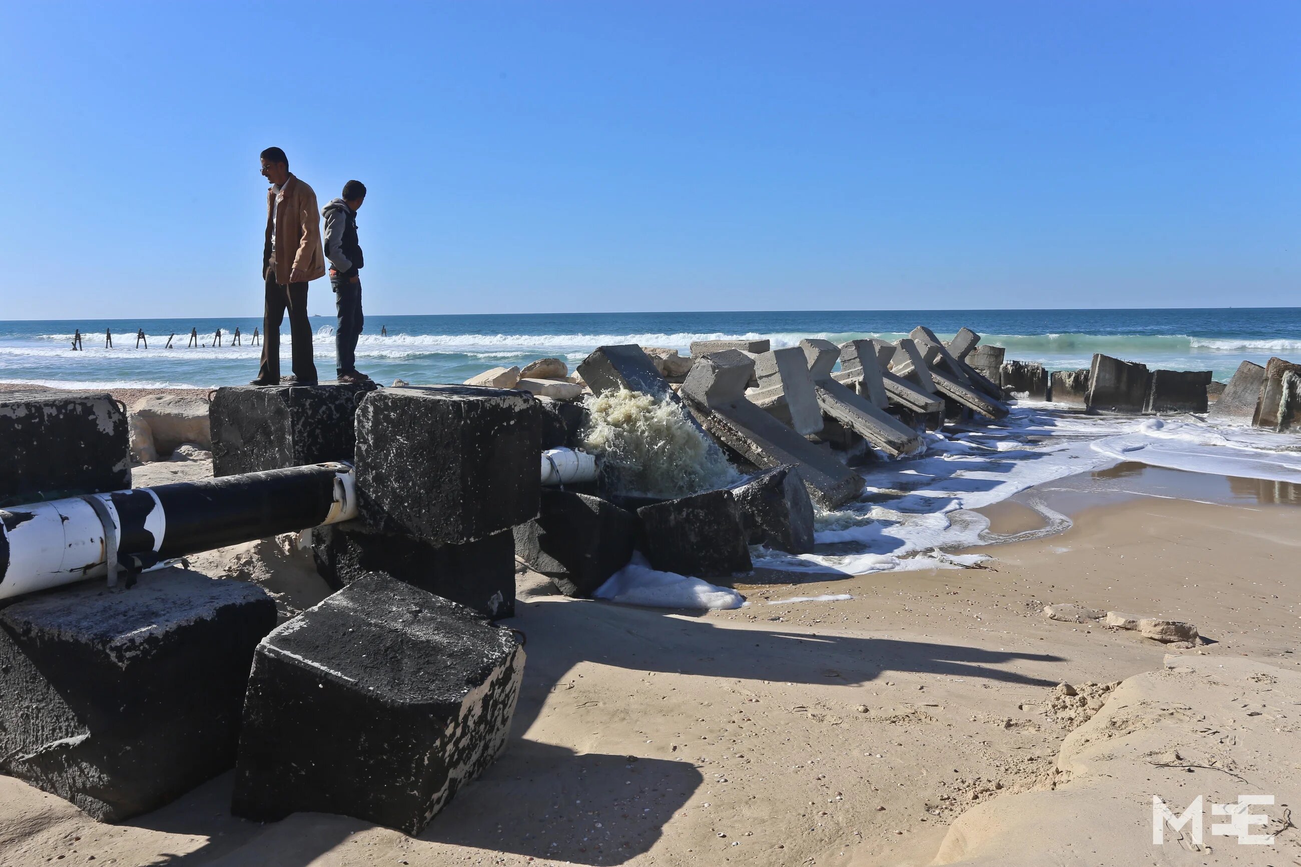 The sewage pipe to the sea was destroyed and now pollution leaks onto nearby agricultural land and into the main fresh-water aquifer. This area is the childrens' only playground.