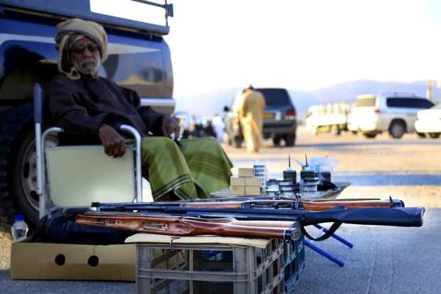 Every morning, except for Fridays when the session shifts to the evening to make way for prayers, these men set up their makeshift stalls and display Oman’s weapons of yore: old rifles, rounded swords, and the traditional Omani daggers, called khanjars. Sometimes even livestock is traded.