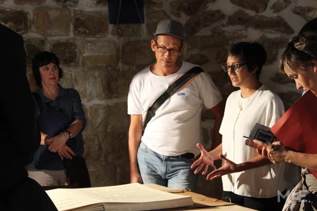 Sawar Qawasmi, curator of Ramallah's Municipality's festival programme, explains an installation that is part of the exhibition 'Sites of Return.' Here, the 'Book of Exile' details stories of Palestinians in refugee camps post-1948 (MEE/Mary Pelletier)