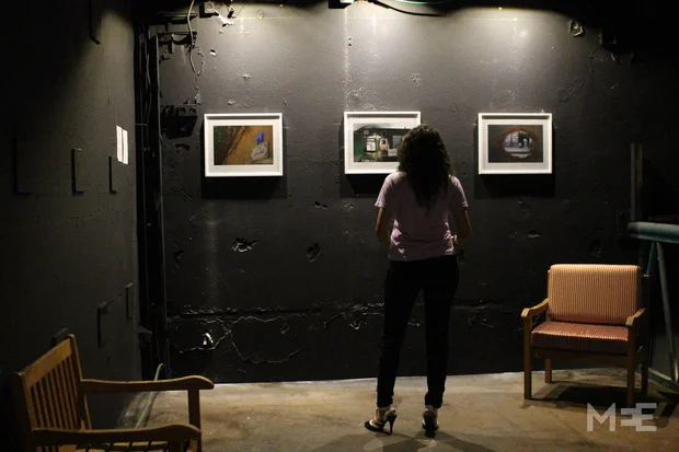 An onlooker takes in photographs by the Athar Group, a collection of young Palestinian photographers who combine photography with a human rights agenda, at 'The People of the Sea' (MEE/Mary Pelletier)