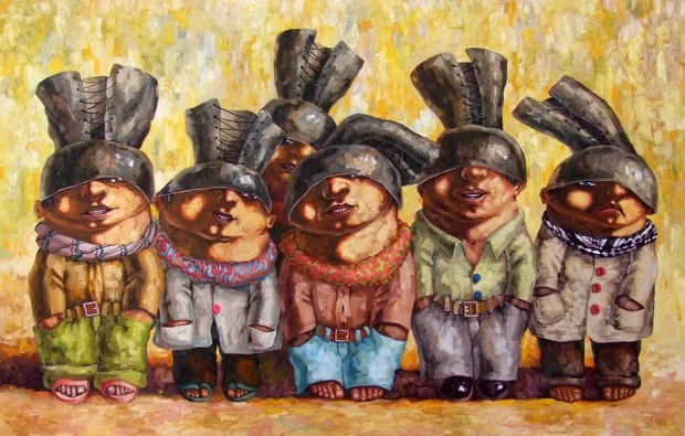 The characters in his paintings appear helpless. They are unwilling to make a move, even though they are standing on their feet. They do not even look interested in taking action to effect a change in their conditions.