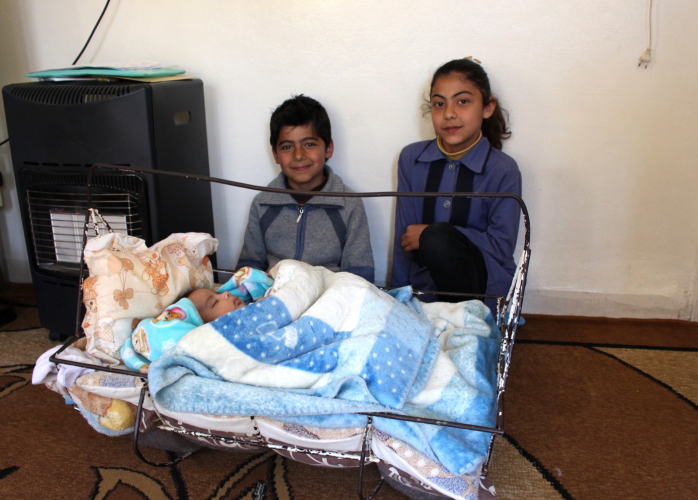 Three of Um Fadel's children pictured in their small apartment in Amman, Jordan (MEE/Hosking)