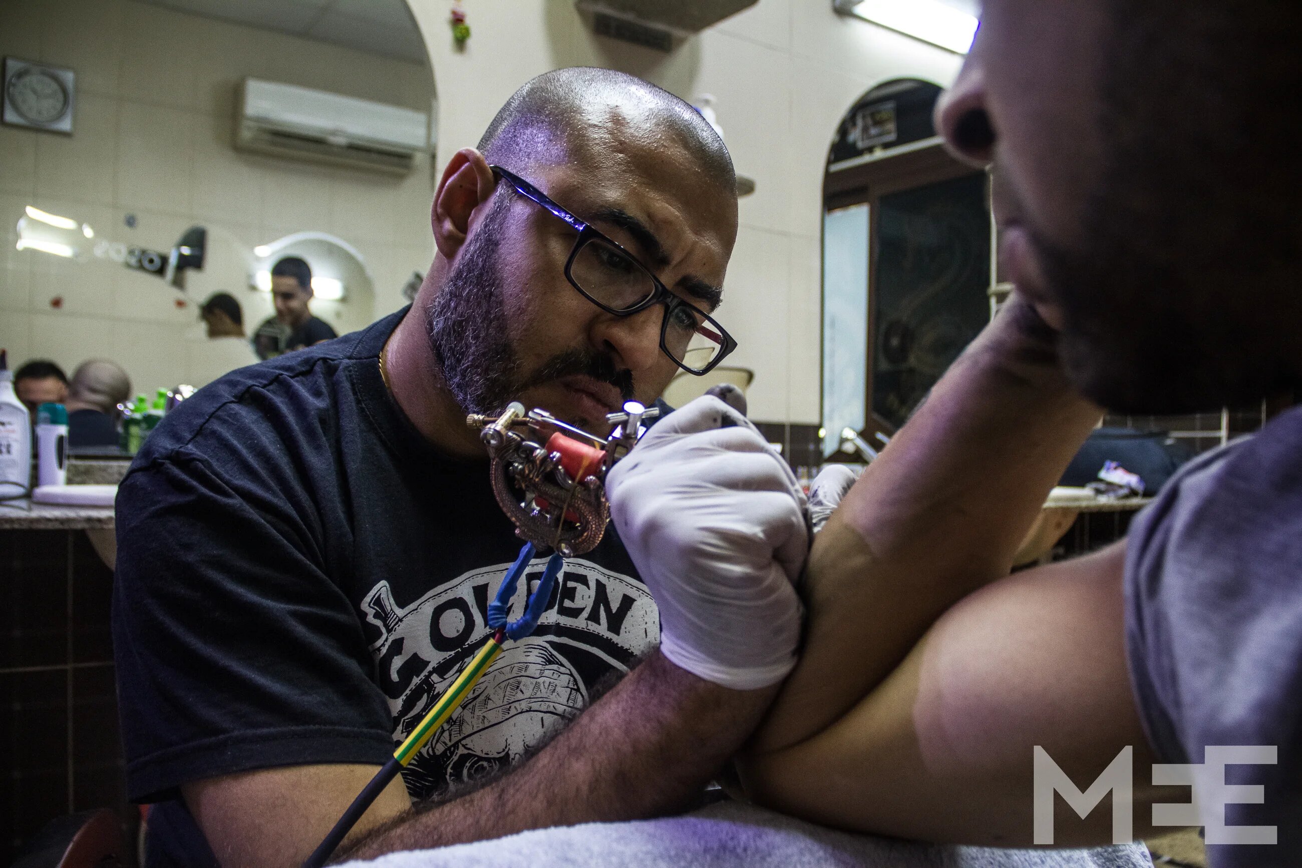 One such customer is Mina Reffat, a young man in his mid-20s who agreed to be photographed while having a tattoo done. Asked why he was getting the tattoo, he told MEE: “I think it is a way of differentiating myself from other people. This is my second tattoo; my first was a religious one to show my pride of Christianity, this one is written in Latin, and means 'Life goes on.' I am hoping to do a tattoo that covers the whole of my right arm in the future.”