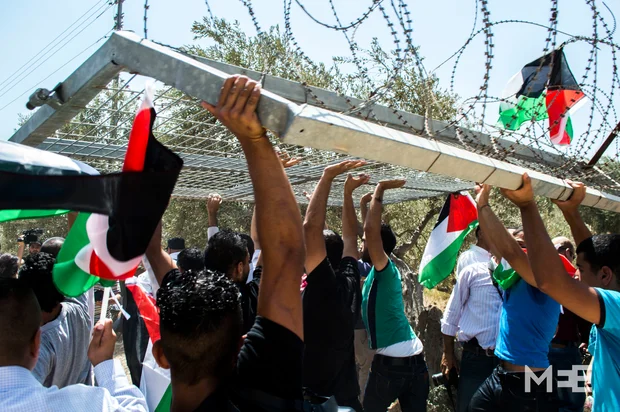 Protesters hurled themselves at the gate and barbed wire, ripping it from the ground and carrying the metal structure away, chanting “How we broke the gate, we will break the wall.”
