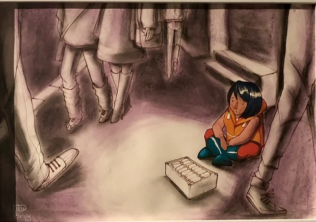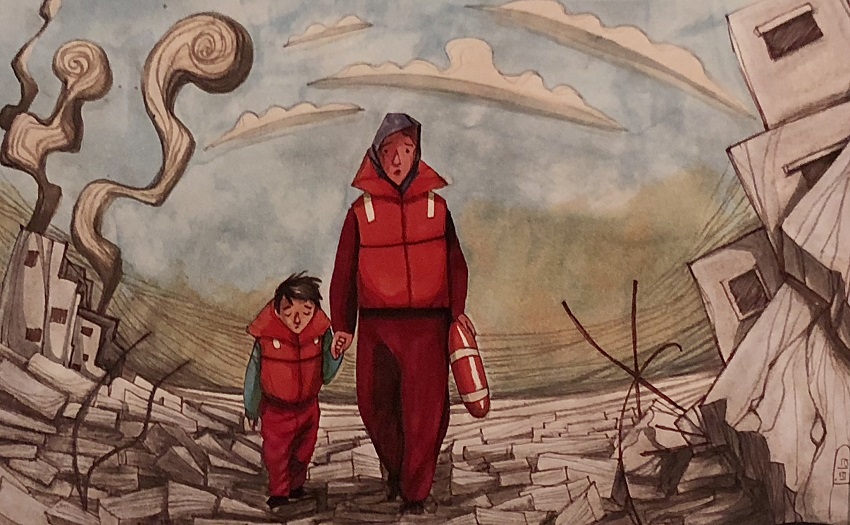 In another piece, a mother and son walk among the ruins of their hometown in Syria, wearing life jackets. In a third, a young, lonesome refugee girl sits on the congested roads of Hamra in Beirut, selling bits and bobs for survival; she, too, is wearing a life jacket. “I wanted to say everyone needs life jackets, not just people in the sea,” Brisly said.
