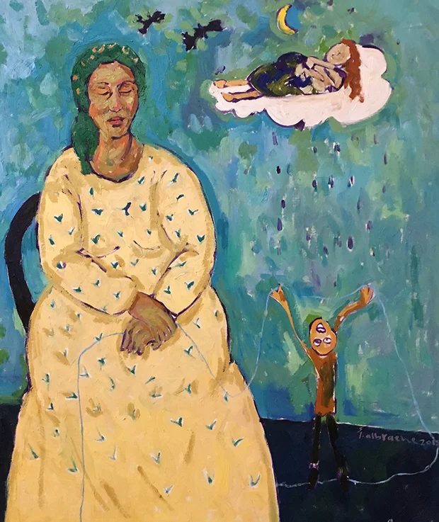 Neighbour of the Moon, one of the series in the exhibition, depicts Albraehe imagining his mother sleeping on a cloud while an older version of the woman dozes off on a chair. Albraehe said that as a toddler he’d watch his mother knit, creating “colourful threads of memories” and inspiring him to become an artist. “She looks at me from the heavens, while I look at her through my memories, and we’re connected by a knitting thread,” he said of the painting.