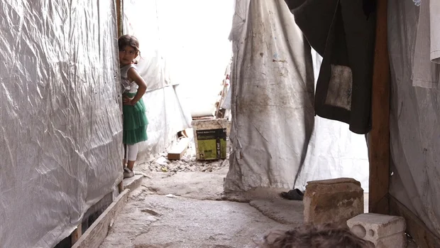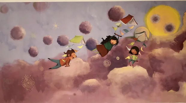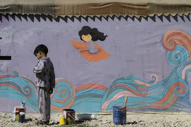 In one of those canvases, by Abdel Hadi and Fadel, two refugee children from a refugee camp in Lebanon's Bekaa Valley, stars and planets light up the sky. In another, Baraa and Nour, two girls from the same camp, evoke happier times, having painted a girl in a floral dress wearing new ballerina shoes.