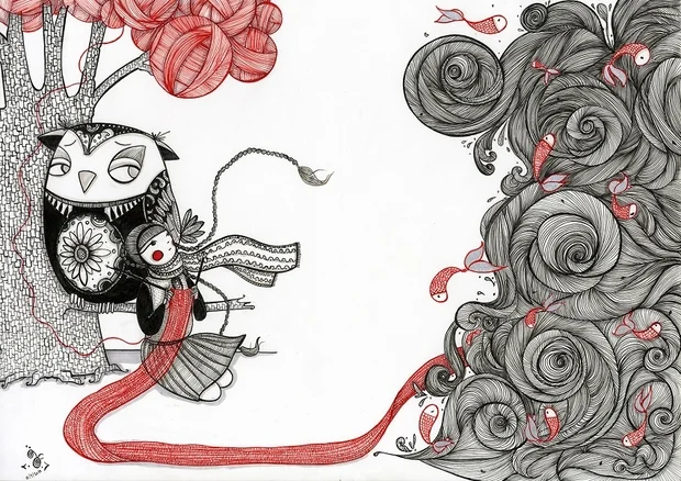 Safia's Sea, a story written by Syrian author Zeina Kanawati, was adapted into an illustration for “Tints of Resilience” by Syrian artist Dima Nachawi. In the story and illustration, a deaf and mute girl knits a scarf as a concerned-looking owl perches atop the branches of a red tree.
