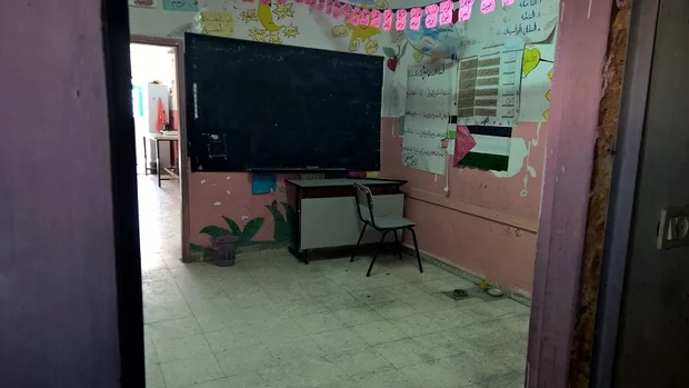 The closest school to Jubbet al-Dhib, Hatin elementary school, located in the village of Beit Ta’mir, consists of a house partially rented out by the Palestinian Authority, which has been shoddily refurbished to host dozens of students in former garages, as well as the windowless basement.