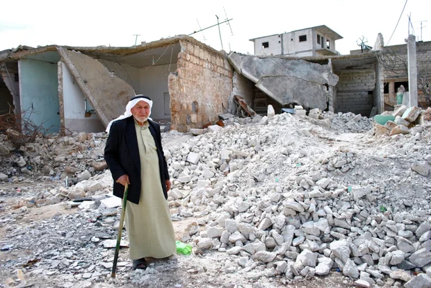 “He didn’t just want to show [the people in his photos] as being passive victims to this senseless violence around them,” she continued, as images of Syrian men, women and children, often standing amidst the ruins of their homes, look on from behind the frames.