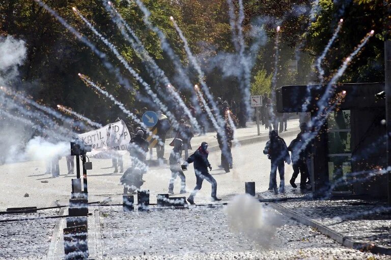 Protesters gather on the streets around dusk screaming for the Syrian town of Kobane, a Kurdish district on the Syrian-Turkey border, currently under Islamic State attack. They throw rocks at Turkish police and are met with high-powered streams of water and quick-release tear gas canisters.